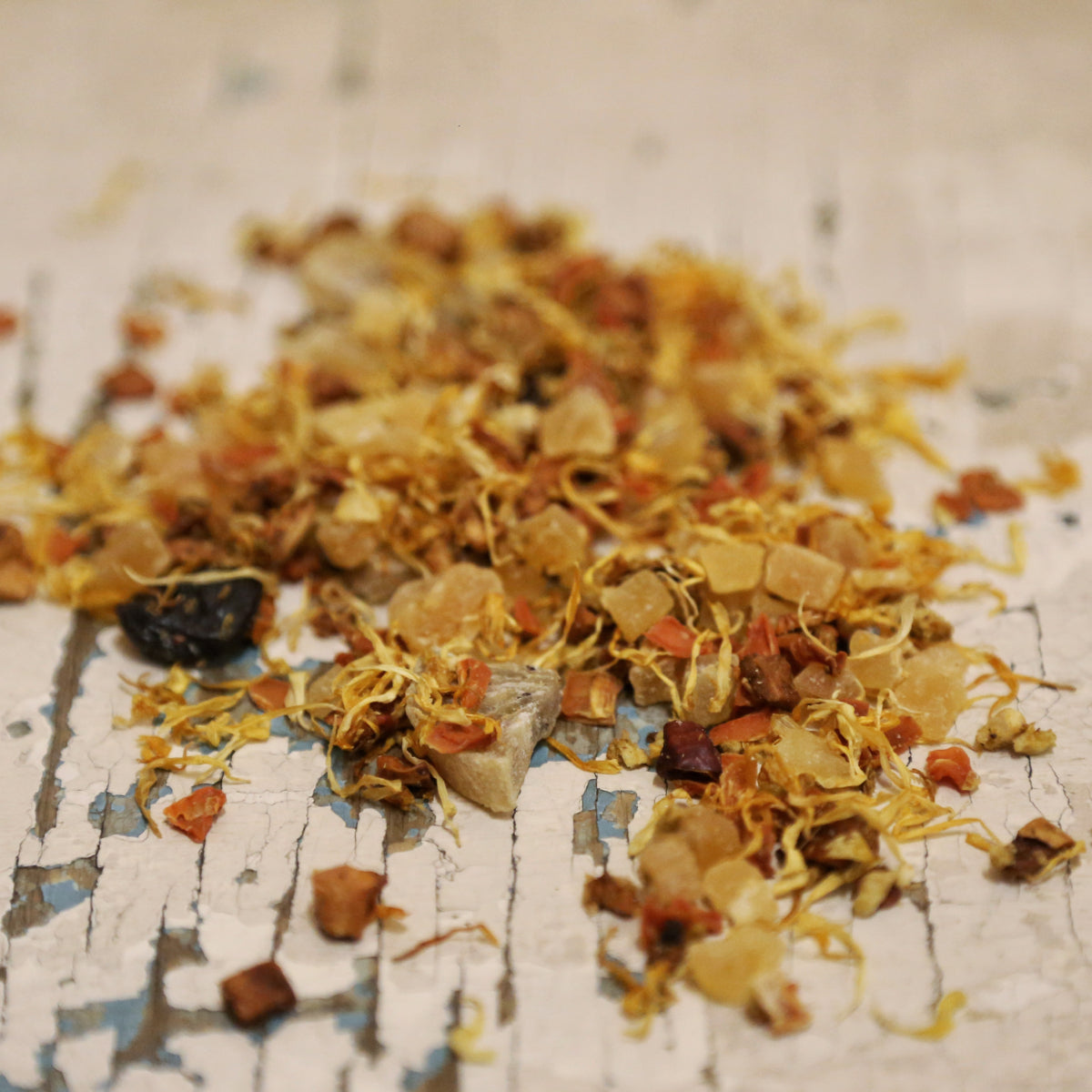 Napar z kiwi, ananasa i nagietka. Produkt masowy. Dostępne w słoikach o pojemności 50 gr, 100 gr i 100 g. W przypadku zakupów o większej wadze konieczne jest dokupienie większej ilości sztuk (w tym przypadku określ, czy chcesz otrzymać produkt w oddzielnych jednostkach, w przeciwnym razie wszystko zostanie zapakowane w tę samą torbę).